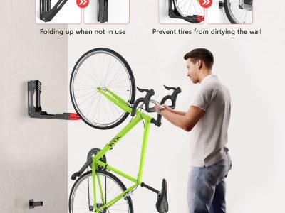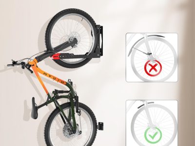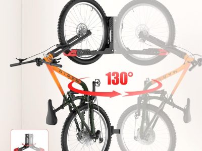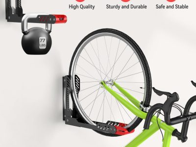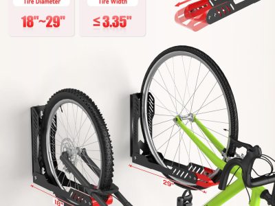 Constructed from durable alloy steel with a red powder-coated finish, each rack supports up to 77 lbs, ensuring stability and long-lasting use. The U-shaped swivel design allows you to rotate the rack to save space while keeping your rims and wheels scratch-free. Adjustable length and foldable hooks make this rack versatile for different bike sizes and tire widths, fitting wheels 18″–29″ in diameter and up to 3.5″ wide.