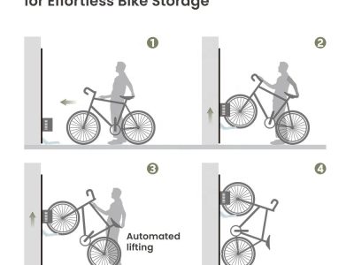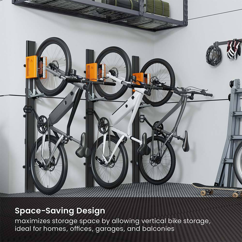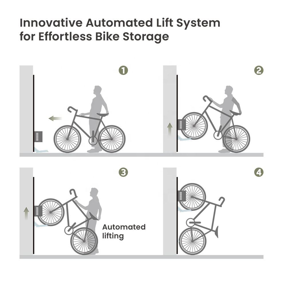 Automated Mechanical Lift System: Effortlessly lifts your bike vertically without electricity, enabling smooth and safe storage.