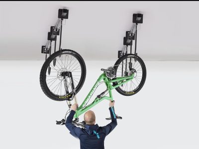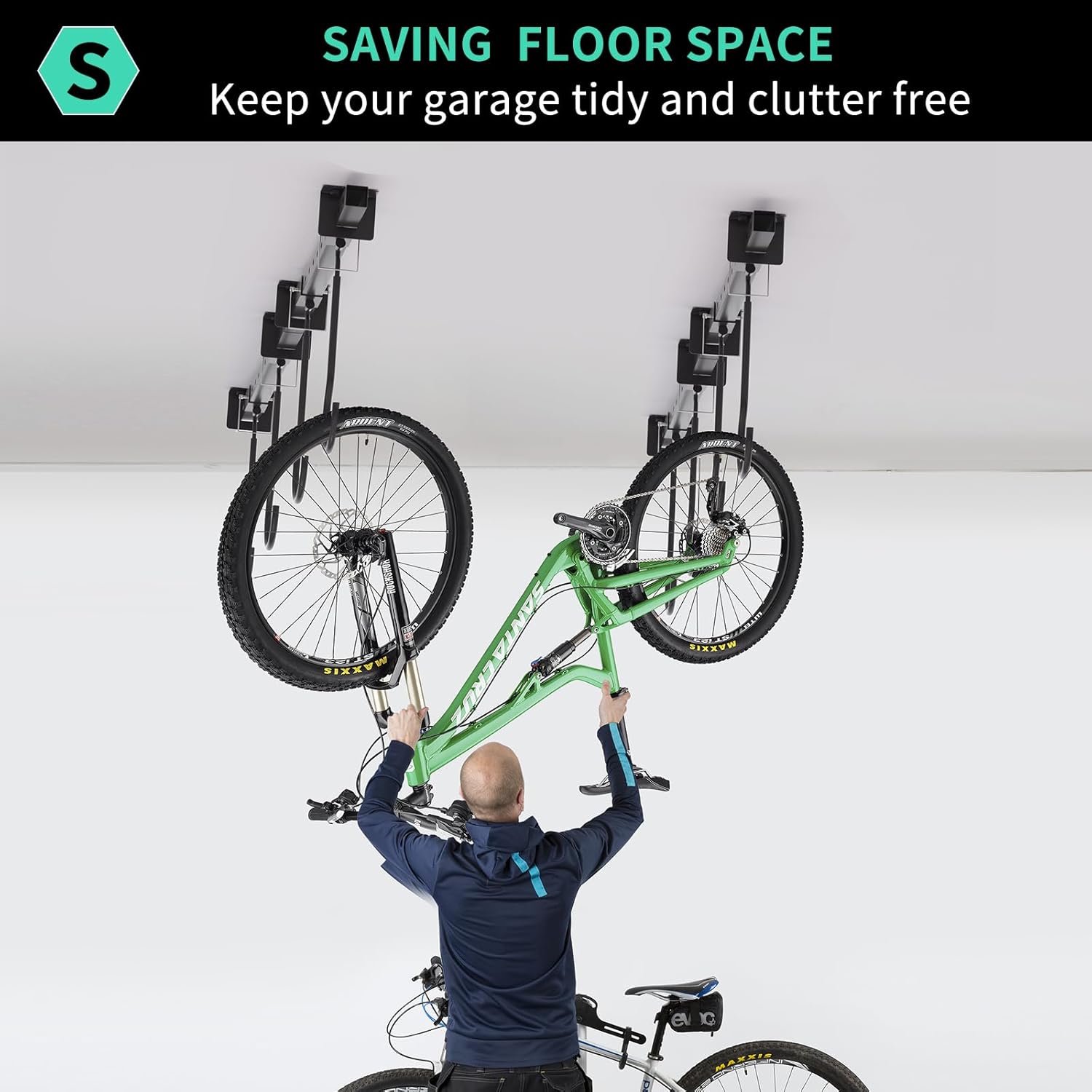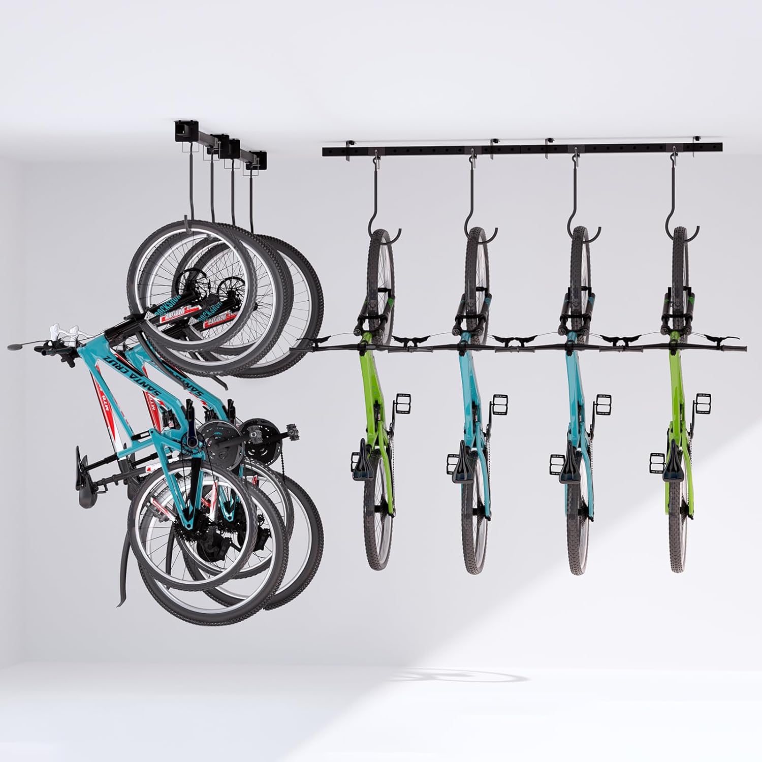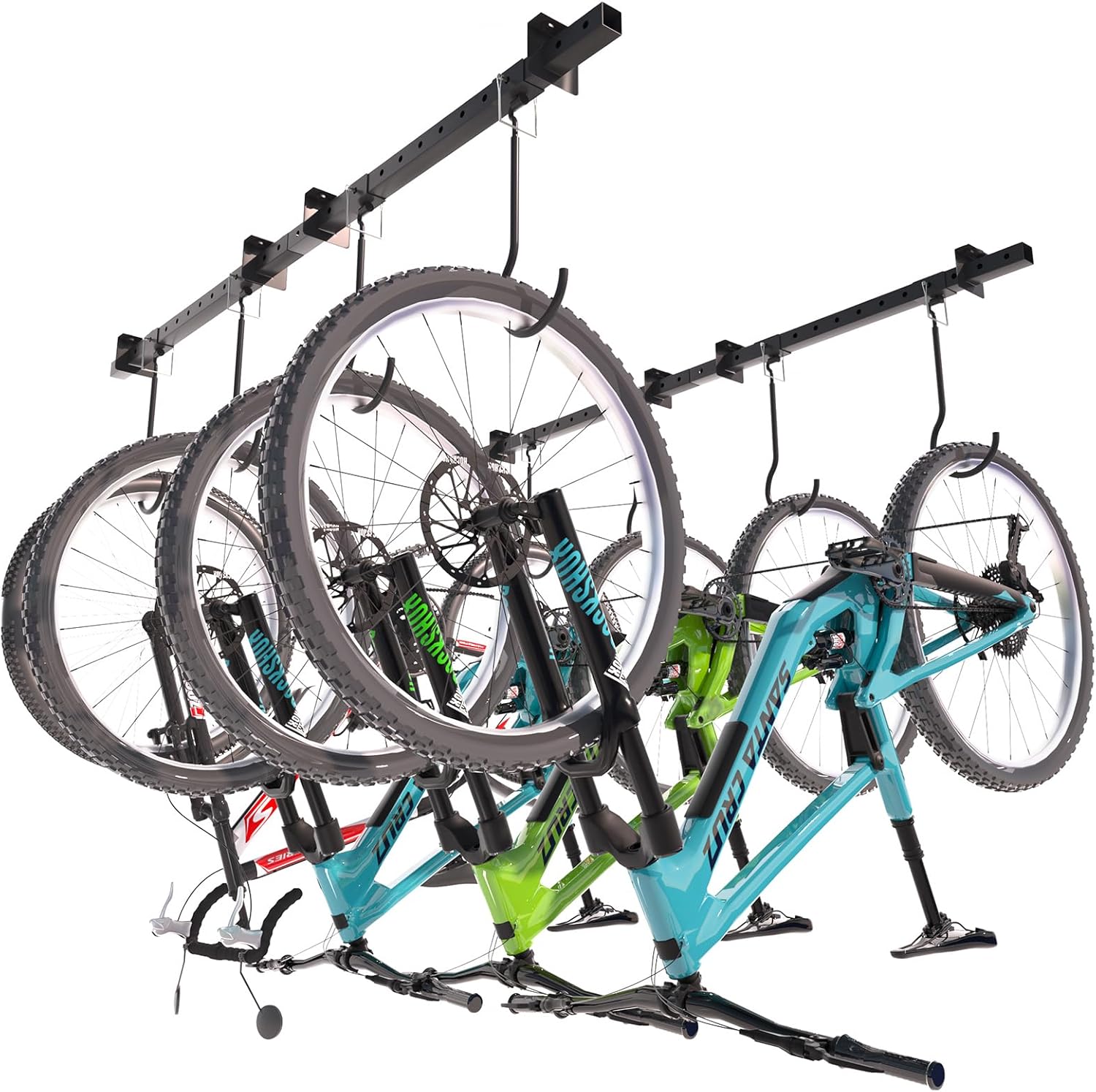 Bicycle ceiling mount for garage stores up to 4 bikes and 250 lbs (50 lbs per hook); use your overhead space wisely to free up valuable floor space in your garage or basement.