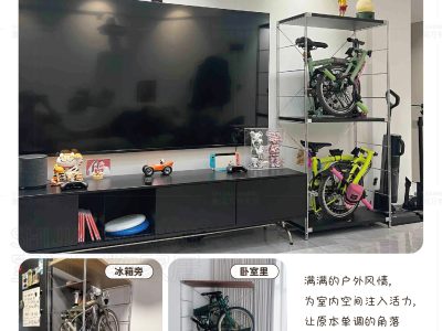 Multi-Layer Vertical Storage: Designed to hold bikes and accessories efficiently within a small footprint.