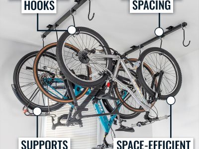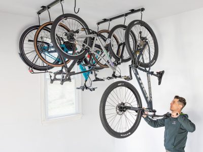 • Overhead storage for mountain bikes, road bikes, electric bikes, kids’ bikes, and more