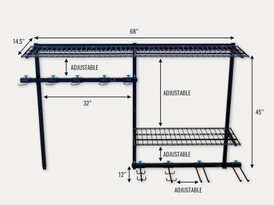 Includes 2-tier storage shelves for helmets, tools, and accessories