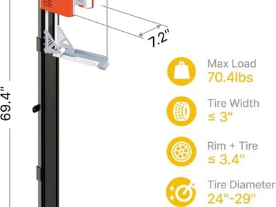 Made from durable anodized aluminum and stainless steel, this wall-mounted vertical bike lift supports 24-29″ bikes with tires up to 86mm in height and 3″ in width, holding up to 71lbs. Its sturdy design is ideal for road, mountain, and e-bikes, providing reliable, long-lasting storage