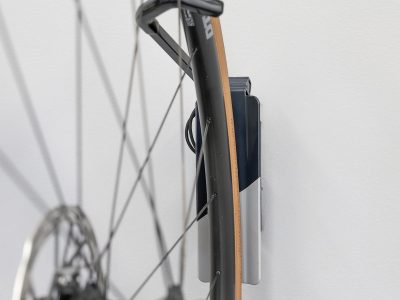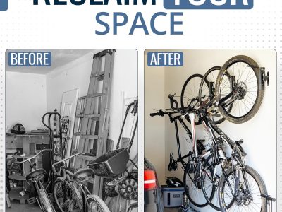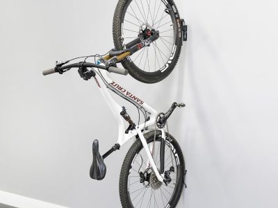 • Wall-mounted vertical bike rack saves garage, shed, or apartment space