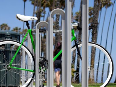 Slotted post design allows multiple bicycles to be parked securely without taking up excess space. -