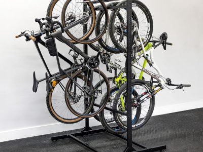 Freestanding 2-sided design holds up to 8 bikes vertically