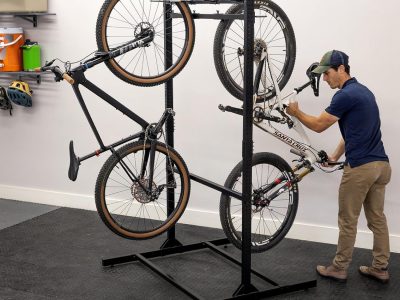 Constructed from industrial-grade steel and aluminum with a durable matte black powder coat, this rack is scratch- and rust-resistant. Adjustable hooks with locking pins and PVC-coated tips protect rims and tires while keeping bikes secure. The rack’s height adjusts from 20″ to 76″ to accommodate bikes of all sizes, and the floor stand design allows you to move it easily within your garage or shed.