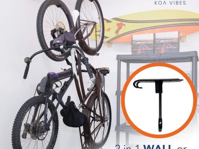 Keep your garage organized and save space with the Swivel Bike Wall & Ceiling Mount by Koa Vibes. This 2-in-1 bike storage rack allows you to mount your bike on the wall or ceiling, providing a flexible solution for road bikes, mountain bikes, e-bikes, beach cruisers, and kids’ bikes.